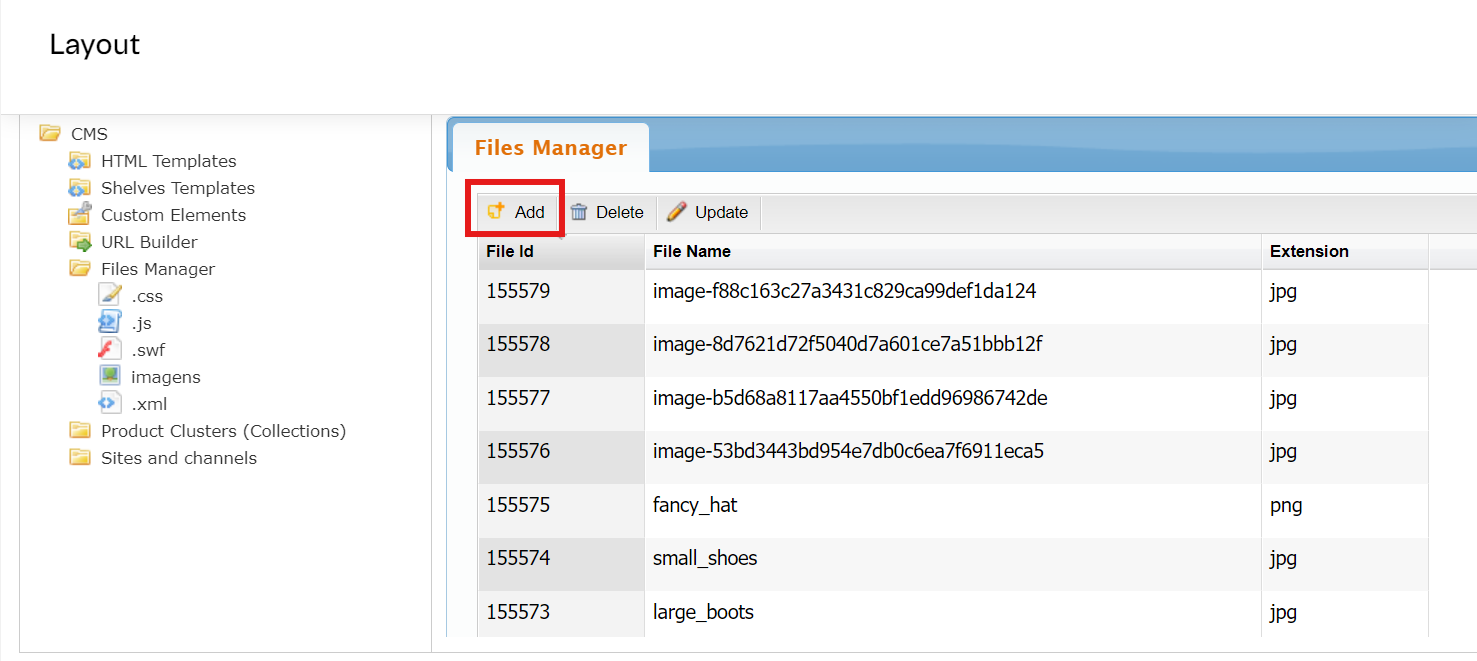 En el Admin VTEX, accede a Storefront > Layout > CMS > Files Manager > imagens.
