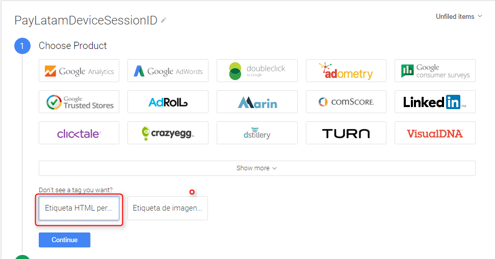 2. Ingresar al apartado etiquetas (tags) para configurar el device sesión id;