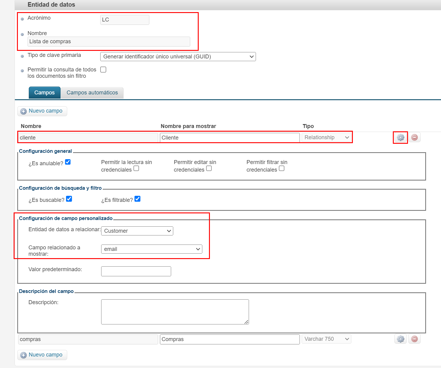 Lista de compras, el acrónimoLCe, inicialmente, el campocomprasde tipoVarchar 750.Para más información sobre cómo rellenar los campos, consulta la guía Entidad de datos.
