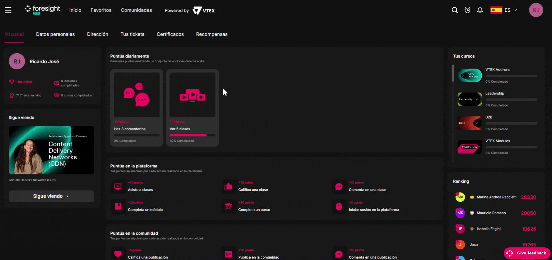 • Puntos en la plataforma: realiza actividades como ver o evaluar una lección.