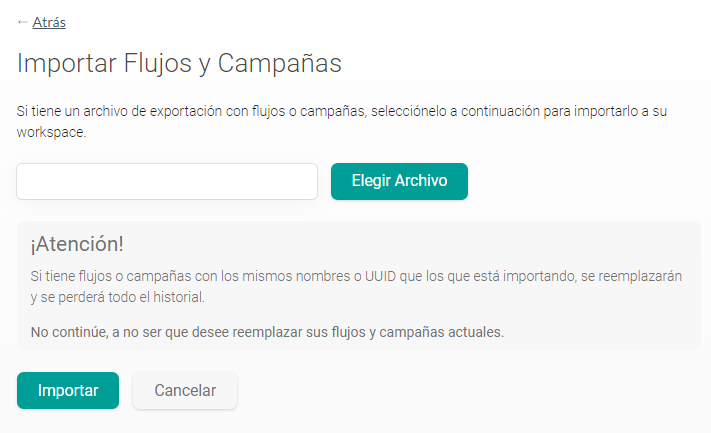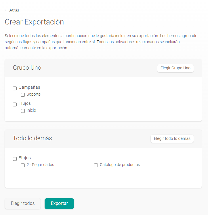 Una vez en la página de exportación, te mostrará todos los flujos y campañas de esa organización, agrupados por uso, es decir, todos los flujos de un mismo grupo interactúan entre sí.