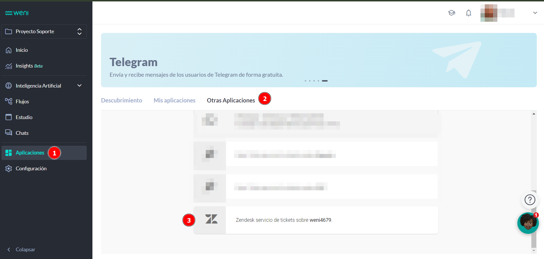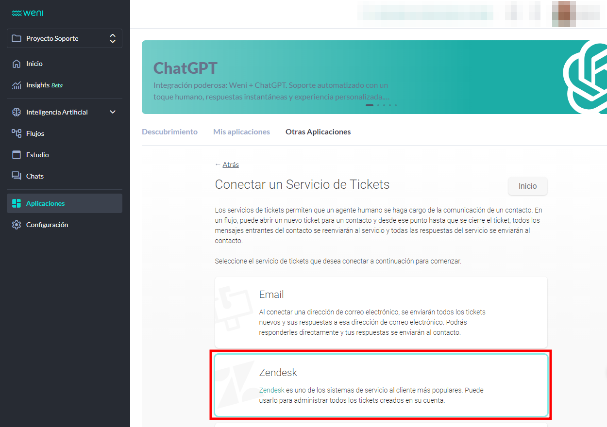 Si todos los pasos se han seguido correctamente, en Aplicaciones > Otras Aplicaciones en la Plataforma Weni, el servicio con Zendesk deberá aparecer como conectado.