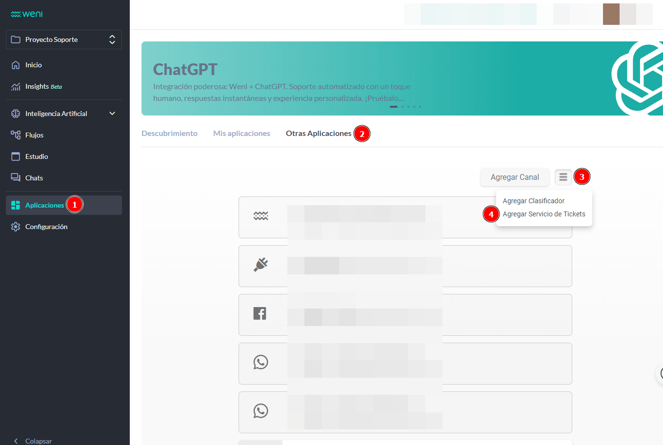 • Dentro de tu proyecto en la plataforma Weni, ve al módulo Applications > Other Apps.