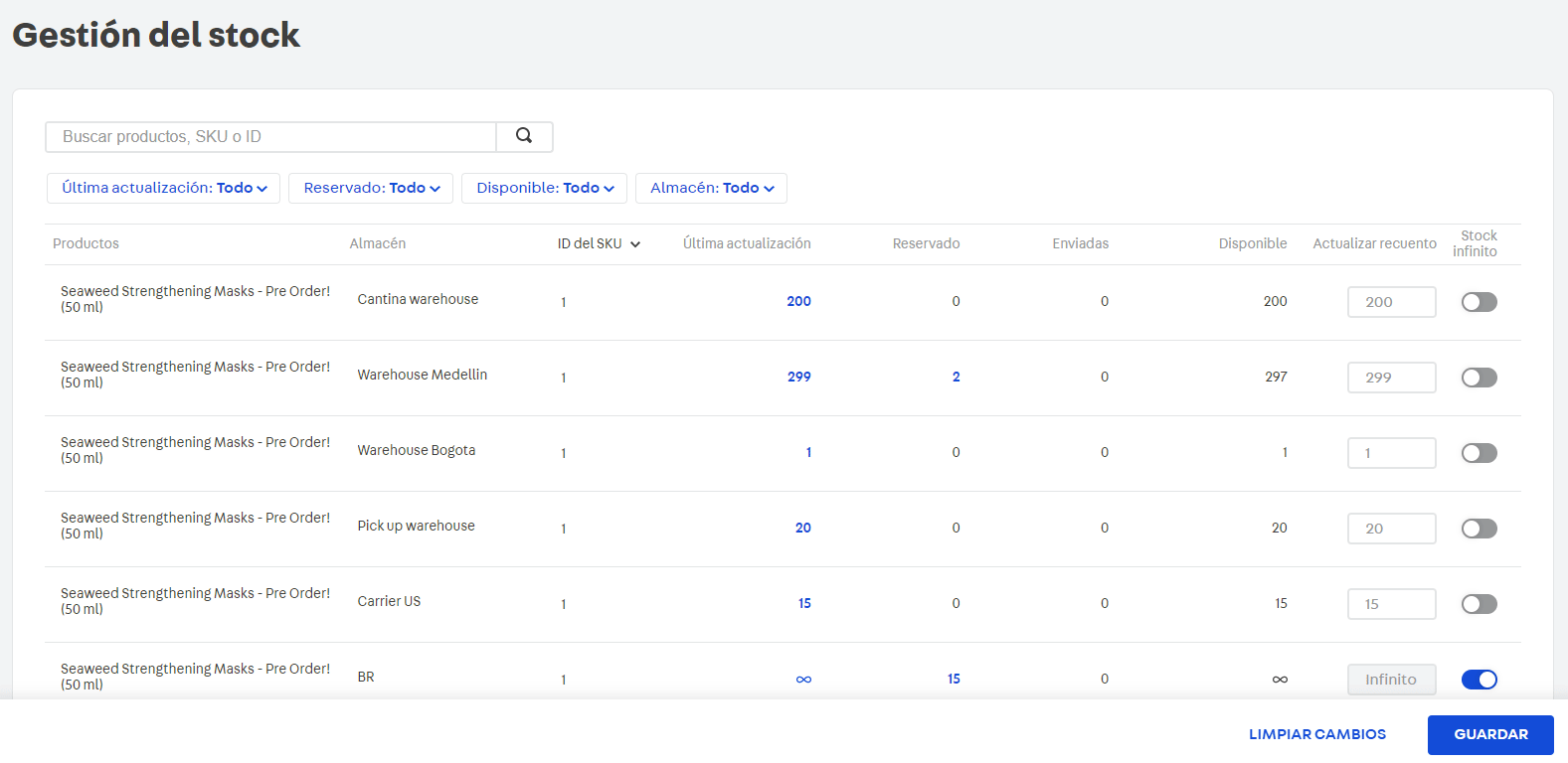 Para que los SKU estén disponibles, incluye las unidades disponibles de cada SKU para cada stock correspondiente. Además, la actualización debe corresponder a la cantidad de ítems disponibles en tu stock. De esta manera, te aseguras de que los SKU disponibles en tu tienda están realmente disponibles para su envío.