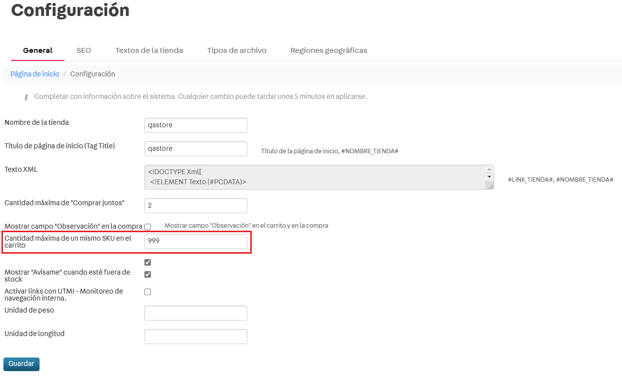 2. En la pestaña General, complete el valor deseado en el campo Cantidad máxima de un mismo SKU en el carrito.