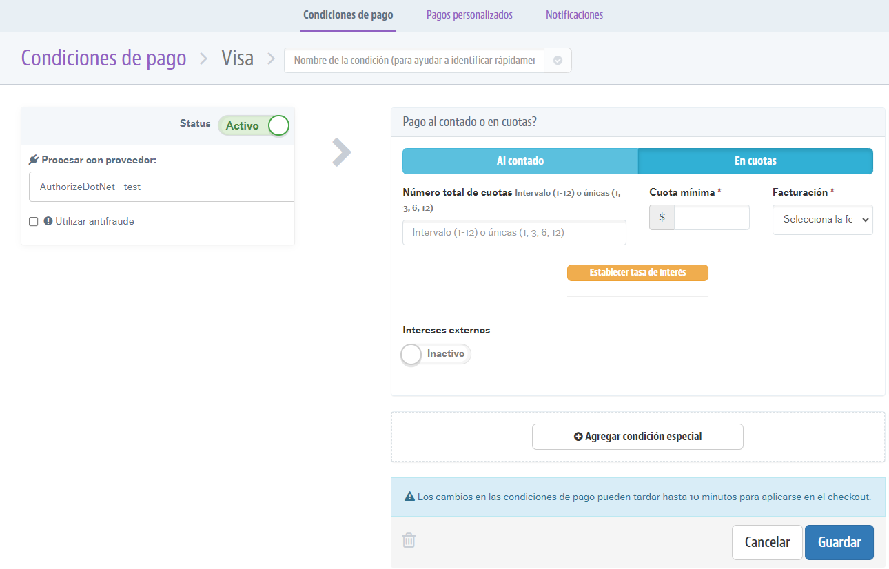Cualquier cambio en las condiciones de pago puede llevar hasta 10 minutos en aparecer en el checkout de su tienda.