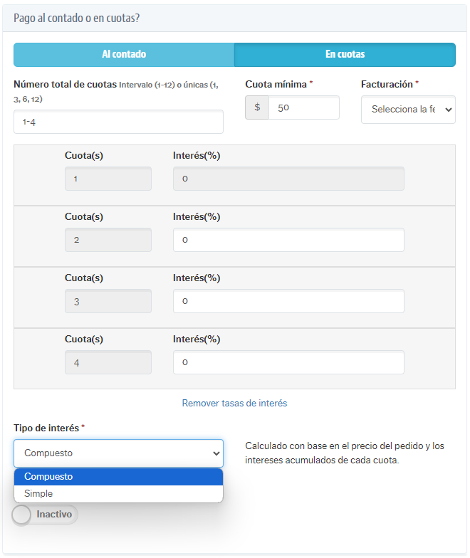 13. En Interés(%), digite el valor del interés que desea si aplicado a cada una de las cuotas. El campo permite agregar valores con hasta 2 decimales (por ejemplo, 1,25 y 10,89 son valores posibles).
