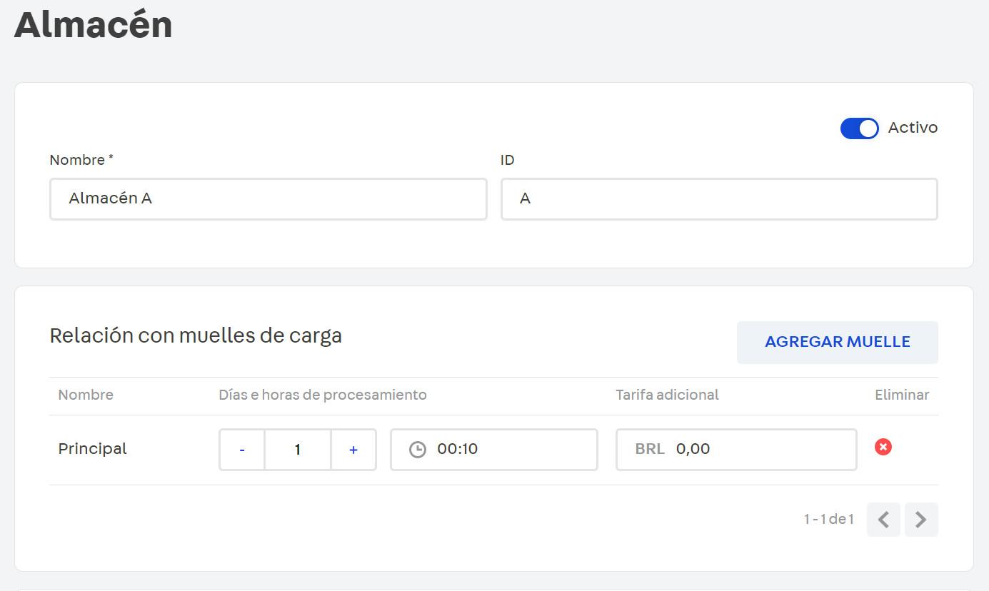 En el ejemplo anterior, el muelle está asociado a la política comercial «Marketplace», que recibirá servicio de la transportadora «Transportadora A».
