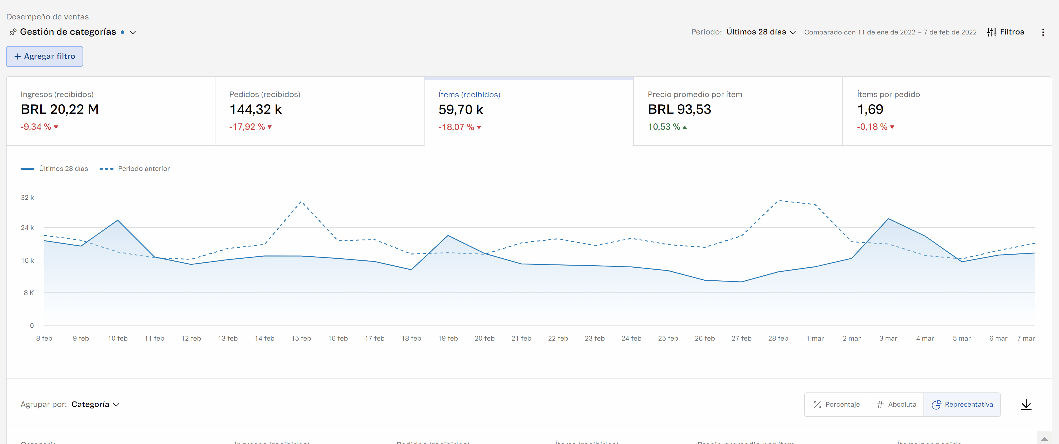 Ten en cuenta que las métricas Ticket promedio y Ítems por pedido no tendrán disponible una vista de Porcentaje o Representativa, ya que son métricas que se calculan dividiendo otras, y la suma de todas las partes de cada una no es igual al Total.
