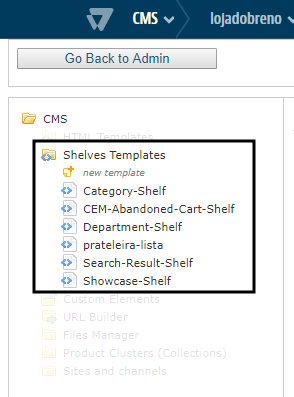 Los estantes se estructuran a partir de código HTML, organizados en templates específicos, llamados Templates de Estante ("Shelves Templates"). Se encuentran en la carpeta CMS, en el módulo Layout. Es en esta carpeta que usted podrá crear nuevos templates y editar los que ya existen.