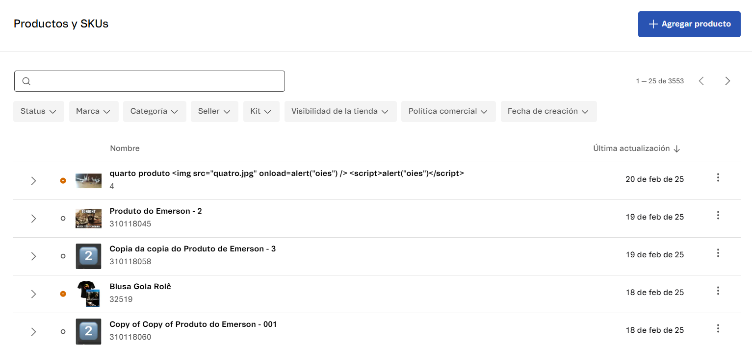 La página Productos y SKUs permite ver y gestionar toda la lista de productos registrados en la tienda, incluyendo la información de los SKU, fecha de actualización y status. Para acceder a la página, ve a Catálogo > Productos y SKUs.