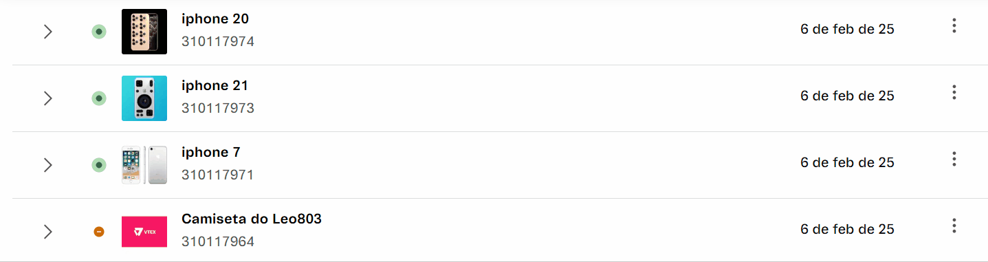 NombreNombre que identifica el producto, definido al crearlo. Debajo del nombre, la página muestra el ID del producto, es decir, el código identificador único del producto.Junto al nombre, cada fila muestra una flecha para ver la lista de SKUs asociada al producto, un icono que representa la disponibilidad del producto y la imagen registrada para el producto.