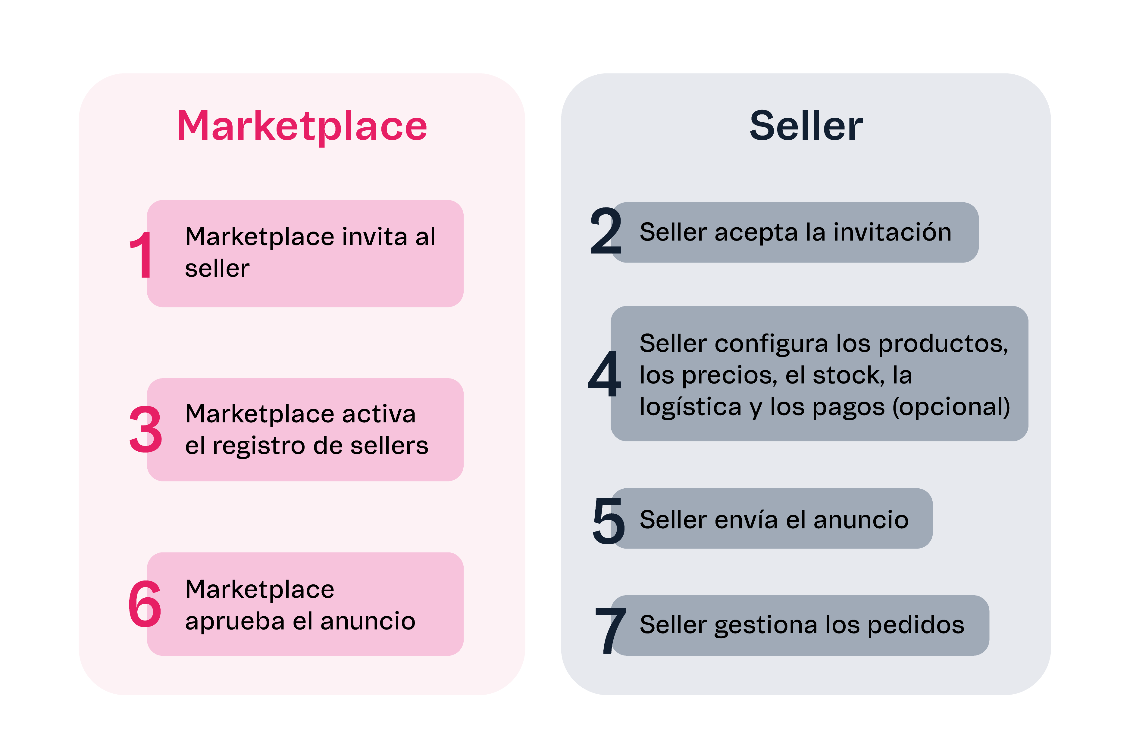 El uso del Seller Portal depende de las acciones del marketplace y del seller, como se muestra en la imagen a continuación: