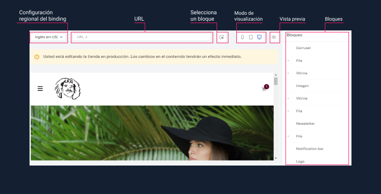 El Site Editor es una interfaz gráfica para la gestión de contenidos de tu storefront. La interfaz te permite crear, editar, publicar y programar cambios en los componentes y el comportamiento de tu storefront.