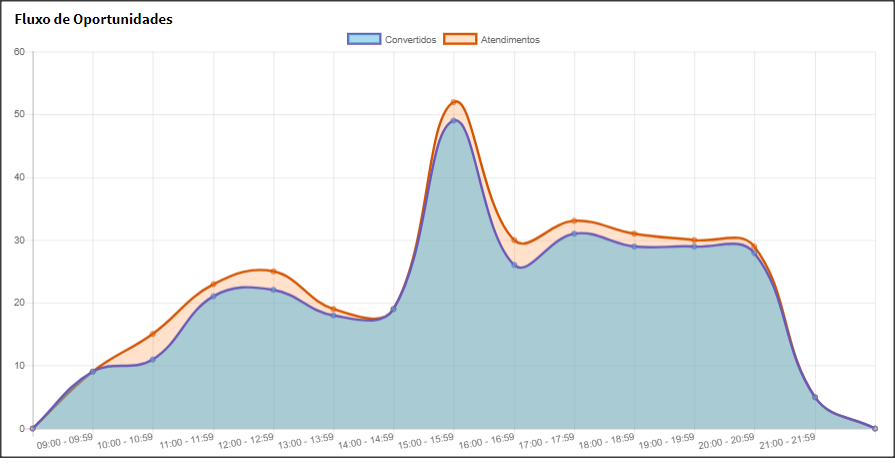 O relatório Fluxo de oportunidades mostra em quais horários a loja recebe o maior número de clientes, permitindo avaliar a relação entre atendimentos e conversões ao longo do dia.