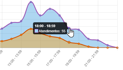 Posicione o cursor sobre os pontos de pico no gráfico para visualizar o número de atendimentos e conversões.