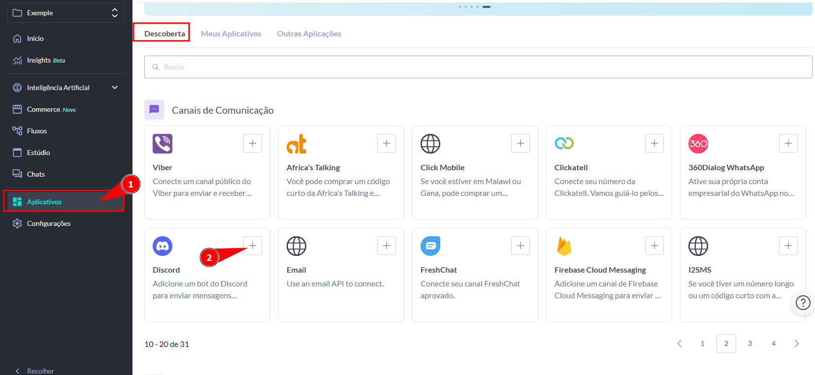 1. Dentro do projeto, vá em: Aplicativos -> Descoberta -> Adicione o Discord
