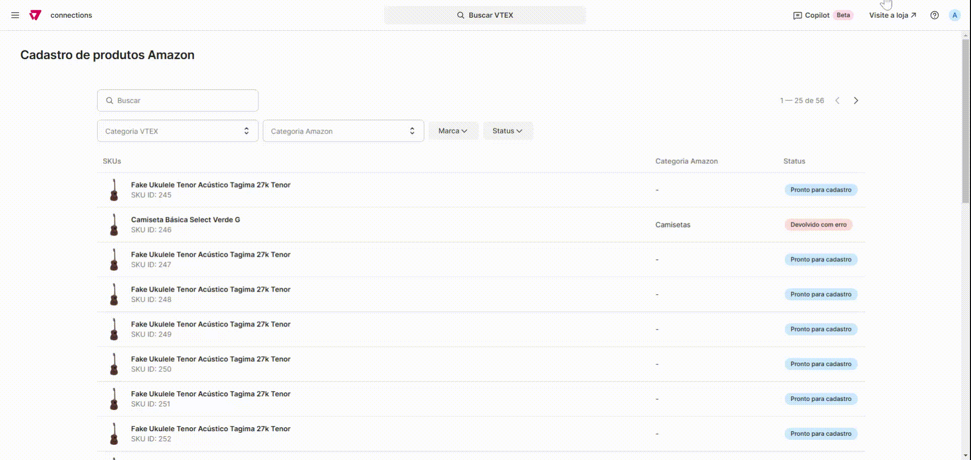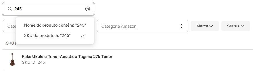 Os SKUs podem ser filtrados por sua Categoria VTEX, Categoria Amazon, Marca ou Status. Os filtros podem ser utilizados individualmente ou combinados, de acordo com a estratégia de cada seller.