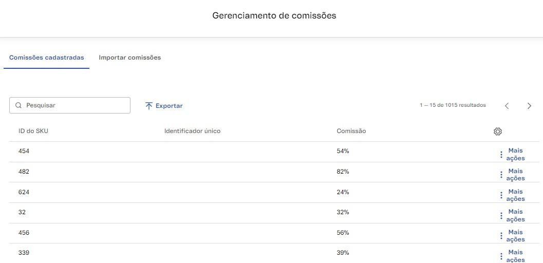 O conteúdo exportado é referente ao comissionamento dos SKUs da listagem no momento da exportação. Se algum filtro estiver ativo, somente as comissões de SKU selecionadas serão exportadas.