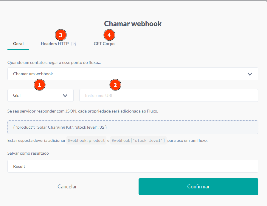 • @webhook.results.0.cliente:Nome do cliente retornado da API. Caso retorne em array é necessário dizer a posição do array que deseja na expressão, usando 0, 1, 2 e assim por diante.