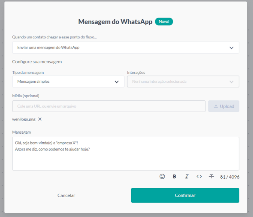 A opção de mensagem simples mantém todas as funcionalidades do cartão enviar mensagem, permitindo o upload de mídia, a formatação de texto e a inserção de emojis.