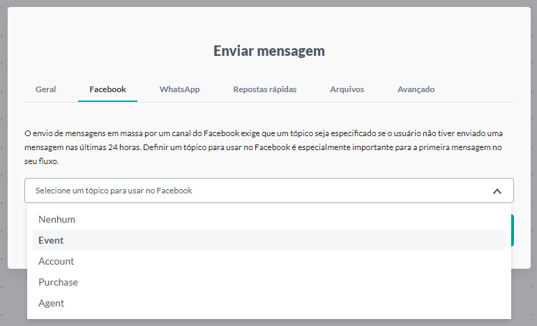 Facebook O envio de mensagens em massa por um canal do Facebook exige que um tópico seja especificado se o usuário não tiver enviado uma mensagem nas últimas 24 horas. Definir um tópico para usar no Facebook é especialmente importante para a primeira mensagem no seu fluxo.