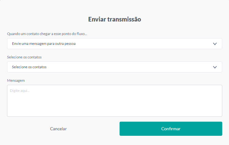 Da mesma forma que podemos mandar uma mensagem para um contato/grupo que não é o atual, nós também podemos começar um novo fluxo. Para decidir quem vai ser iniciado pelo fluxo, podemos escolher entre três opções:
