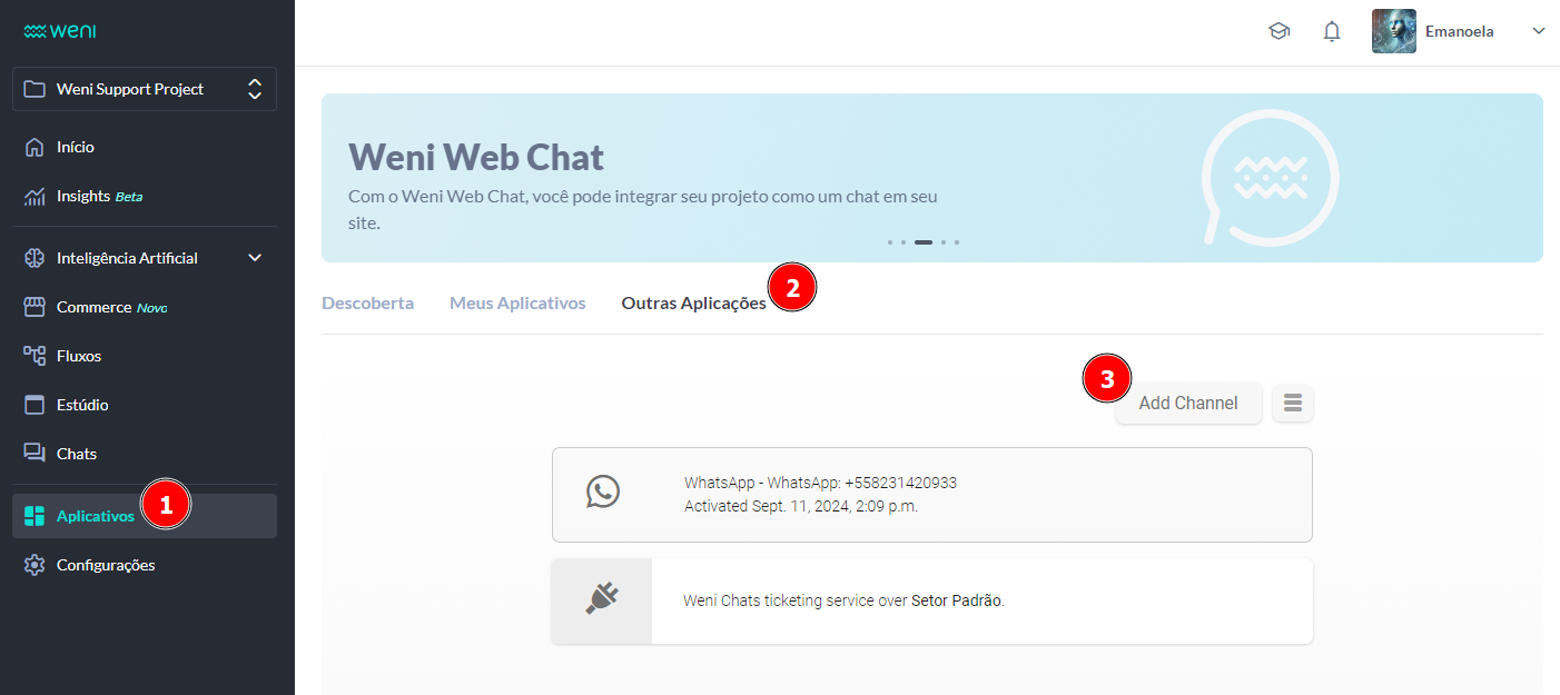 - Em seu projeto: Aplicativos > Outras Aplicações > Add Channel
