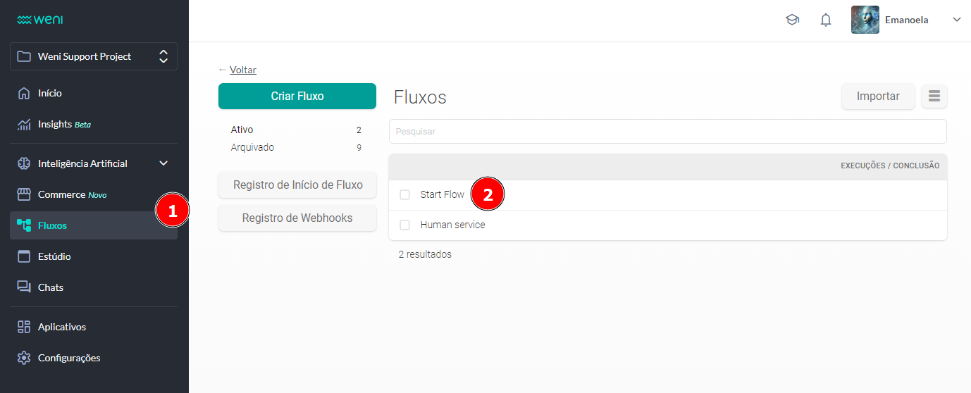 Em Fluxo é definido como o fluxo a ser iniciado