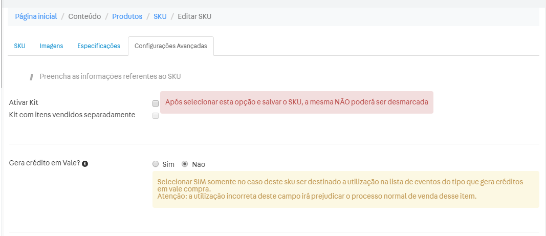 • O SKU precisa ser configurado para gerar crédito em vale.