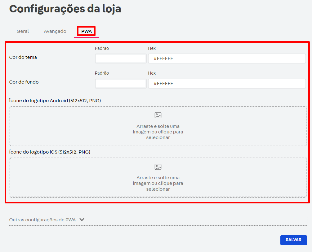 Em Outras configurações de PWA, preencha os campos conforme orientações abaixo:
