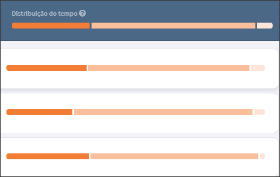 A barra de distribuição apresenta a divisão do tempo médio entre atendimentos, fila de espera e pausas, tanto para a loja quanto para cada vendedor individualmente.