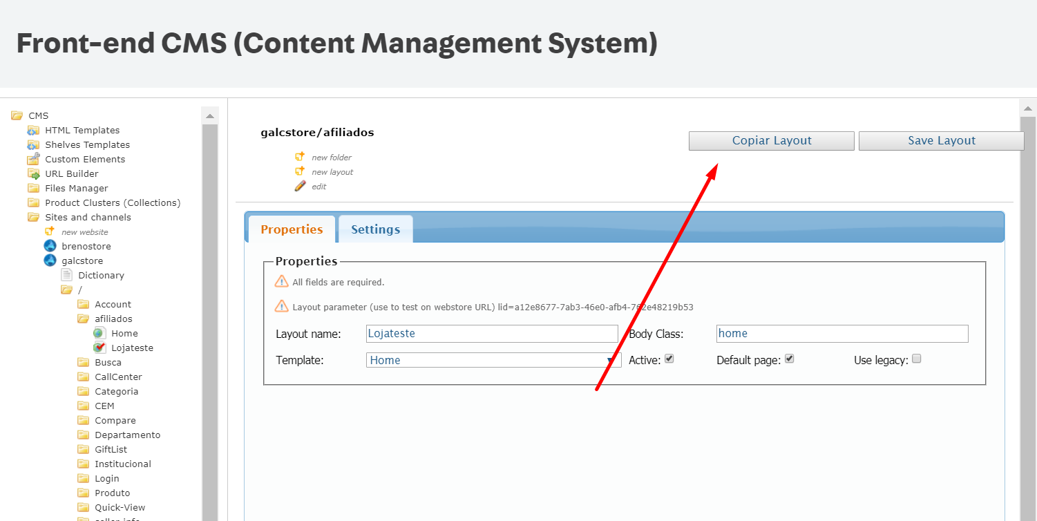 Se você tem mais de um web site em sua loja e deseja copiar um layout de um deles para outro web site, pode fazer isso usando o botão Copiar Layout.