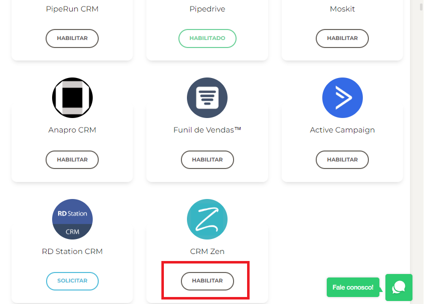 2. Acesse Configurações > Integrações > Vendas > CRM Zen > Habilitar.