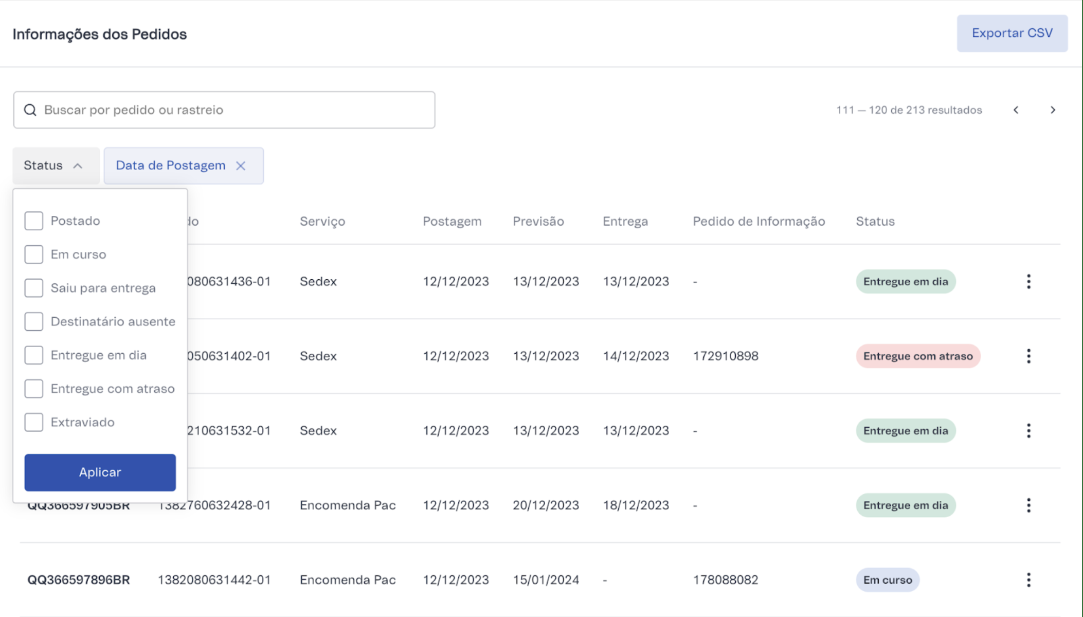 • Status: os status disponíveis são: Postado, Em curso, Saiu para entrega, Destinatário ausente, Entregue em dia, Entregue com atraso, Extraviado.