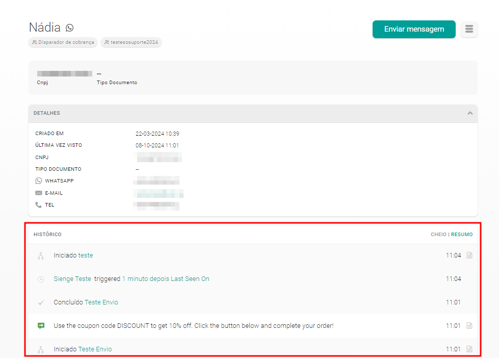 Ao clicar no contato desejado, uma nova tela será aberta onde você poderá ver o histórico do contato.