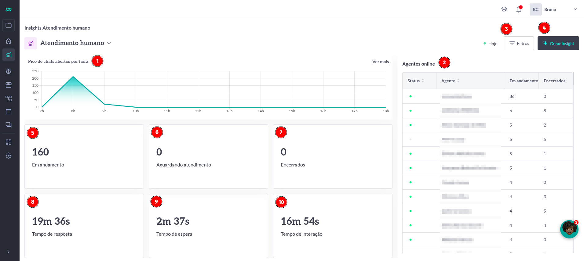 A tela de Insights de Atendimento Humano fornece dados e métricas essenciais sobre os atendimentos em andamento, encerrados, verificar quais agentes estão on-line e o desempenho da equipe. Esses dados ajudam na análise e na otimização do atendimento, permitindo ajustes estratégicos para melhorar a experiência do usuário.