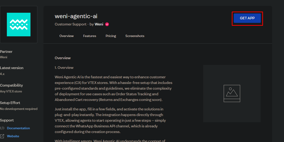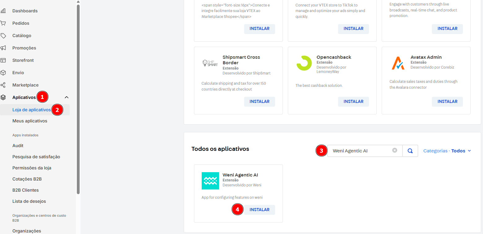 Para realizar a instalação você deve acessar o seu ambiente VTEX e deverá procurar pelo módulo de Aplicativos, após isso busque por loja de aplicativos e tente procurar por Weni Agentic AI. Fazendo isso, será possível encontrar o App da Weni, como segue a imagem abaixo.