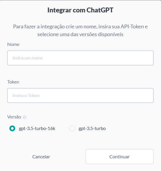 Preencha os campos com Nome, Token (seu token de consumo da API do chatGPT) e Versão. E para concluir essa etapa clique em continuar: