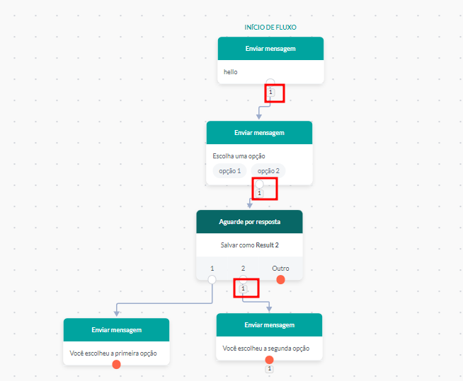 Os marcadores de rota são números guias que aparecem abaixo de cada carta de ação e decisão, mostrando quantas vezes as pessoas passaram por aquela rota no fluxo. Ferramenta bem interessante para identificar qual o caminho está sendo o mais procurado pelos seus usuários, além de sempre ser atualizada em tempo real. Também é possível identificar certos gargalos, como quando uma pergunta segurar um usuário tempo demais no fluxo.