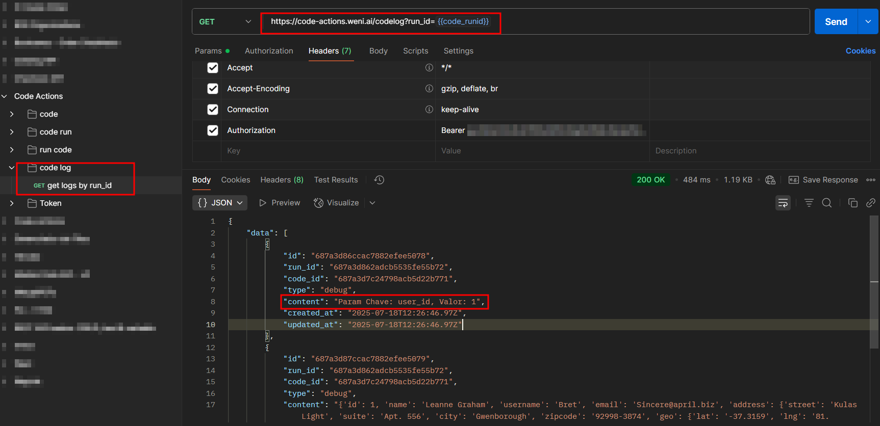 Com o ID da execução retornado na request acima, você conseguirá pegar mais detalhes sobre uma determinada execução, como os debugs.