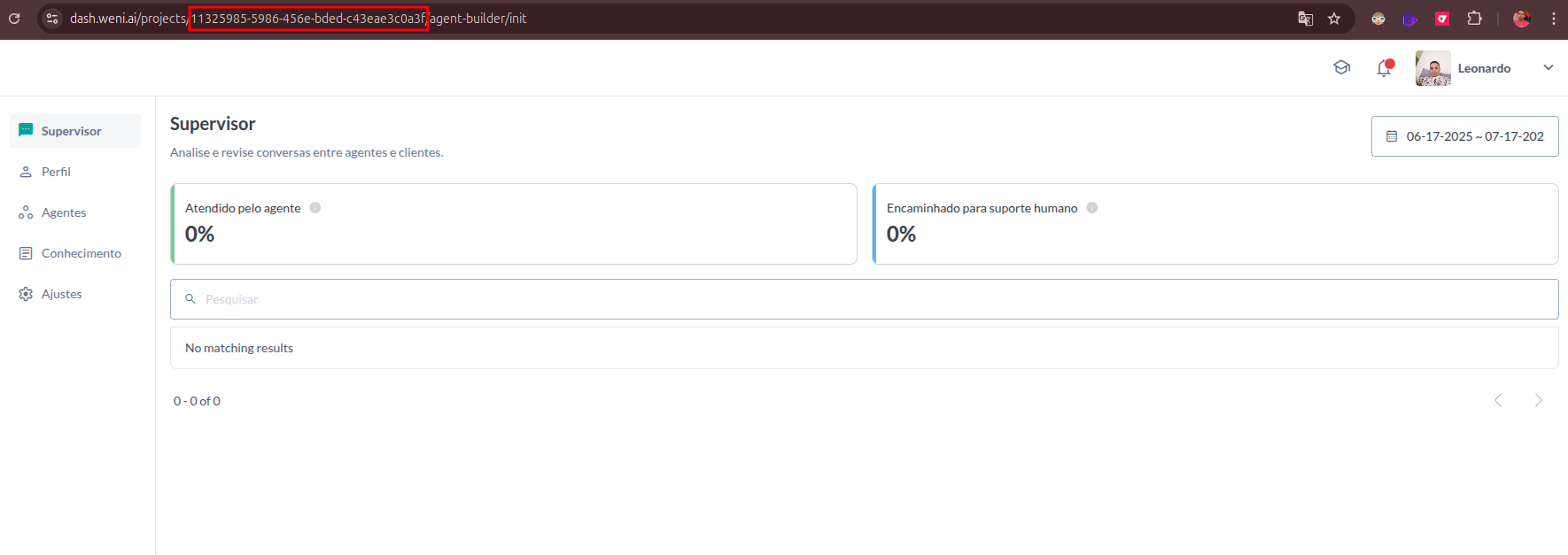 - Essa informação você conseguirá pegar na URL do seu projeto na Weni Plataforma, como segue na imagem abaixo: