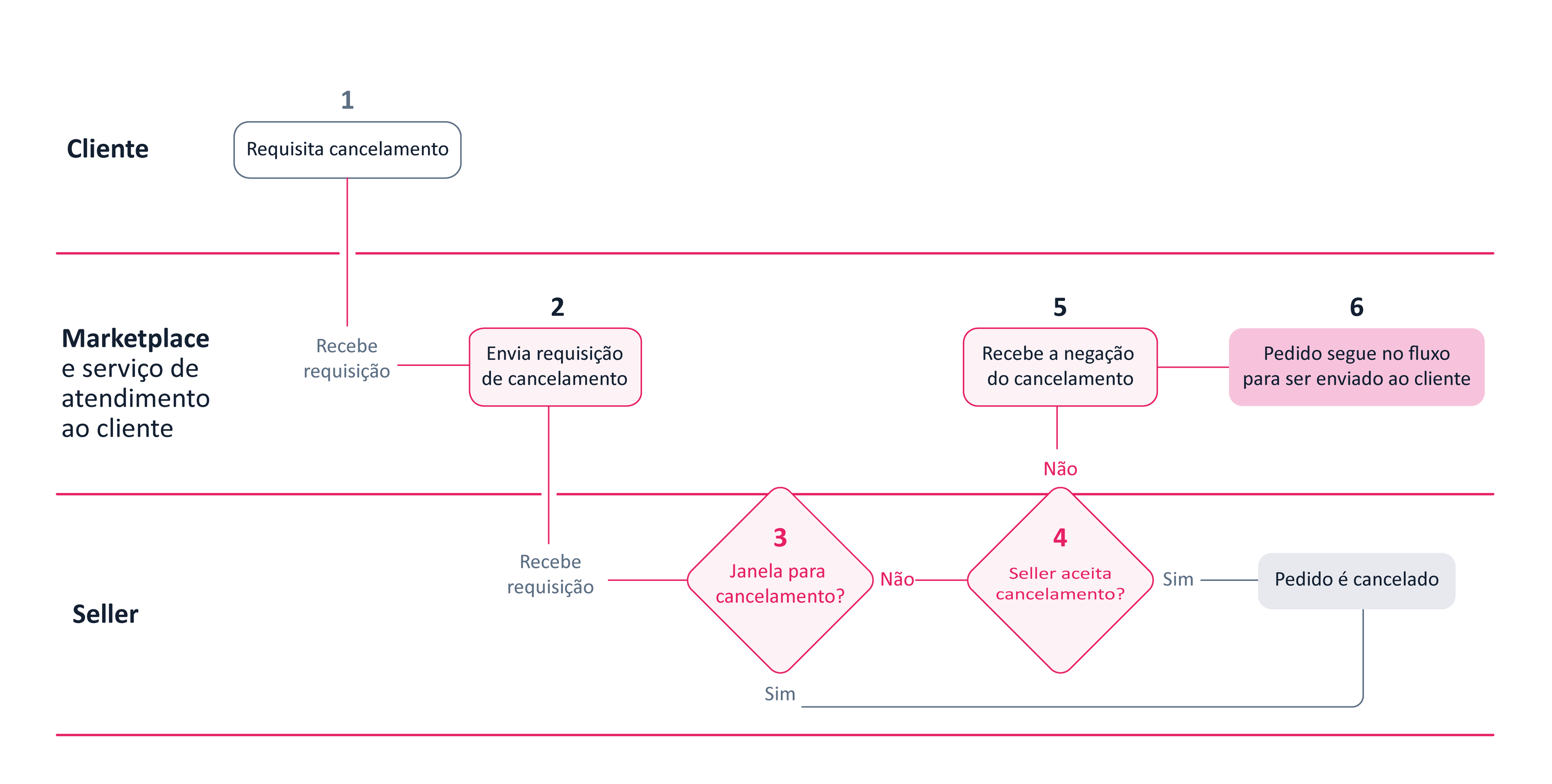 O fluxo de pedidos tem uma janela para cancelamento (carência) na qual o cliente pode cancelar automaticamente um pedido. Com exceção desse período, o seller pode recusar uma solicitação de cancelamento do pedido, independente se ela foi realizada pelo cliente ou pelo marketplace.