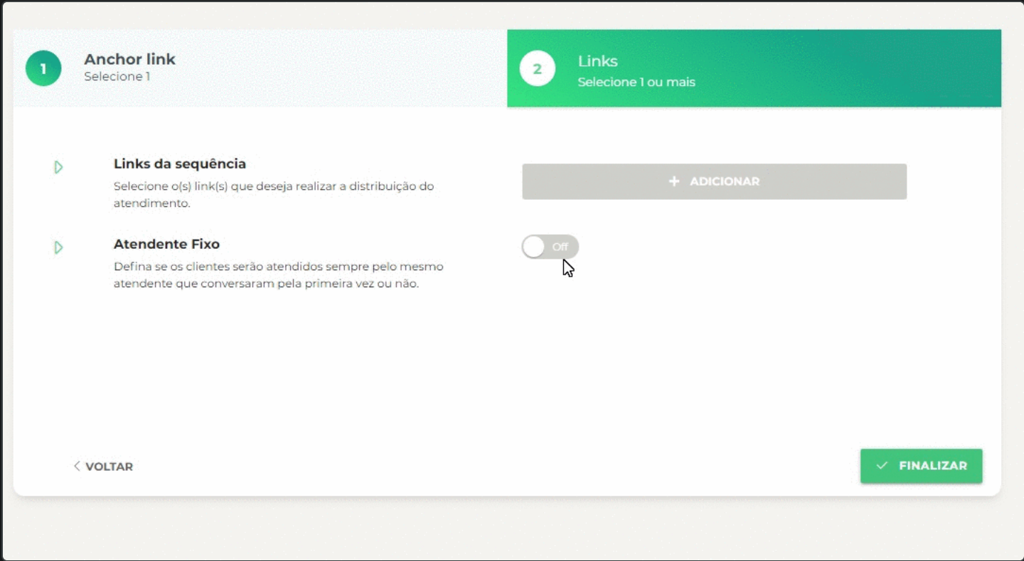 Em Link Âncora, como o próprio nome já diz, você irá selecionar o link principal da central. Esse é o link que você irá divulgar, será o link responsável por fazer a ligação com os demais atendentes.