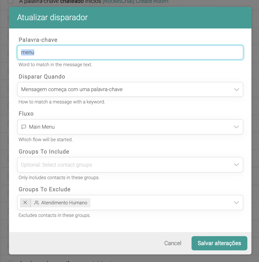 Este pode ser um fluxo extremamente simples, onde a única ação é remover o contato do grupo de controle Atendimento Humano: