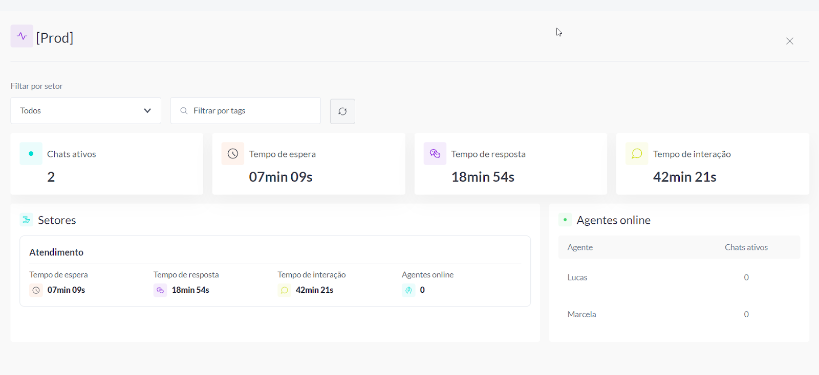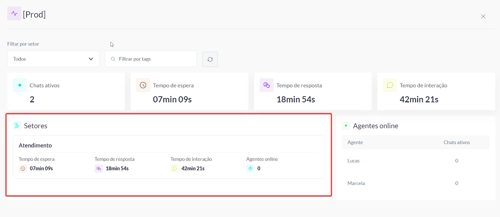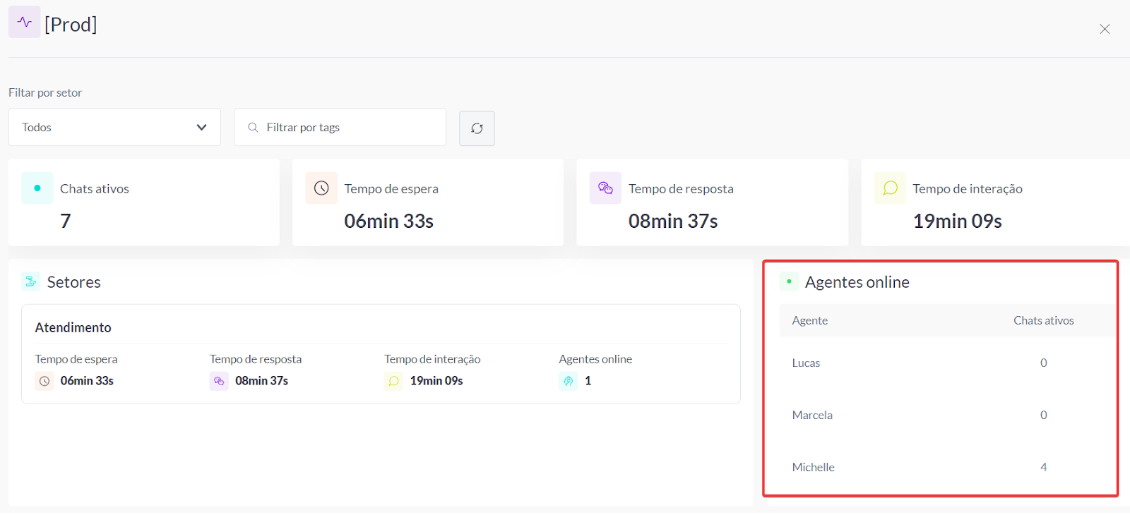 Ao lado dos setores listados, está a coluna de agentes online, nela estão listados os agentes que estão com status online e também a quantidade de chats ativos desses agentes.