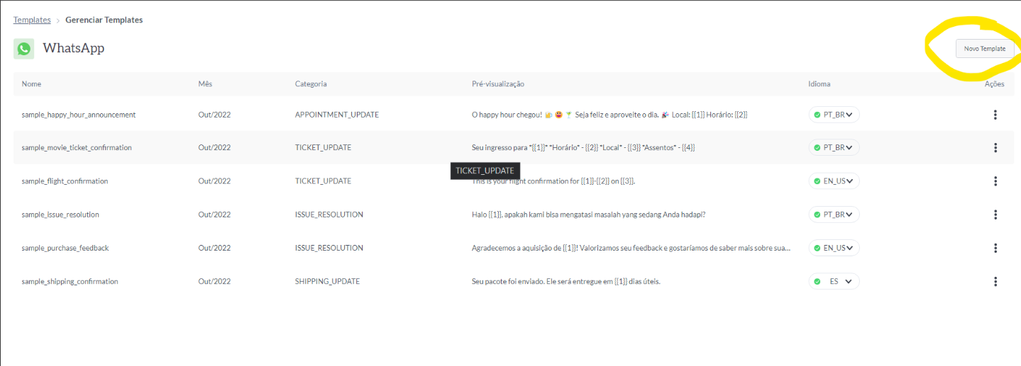 4. Irá abrir um painel onde você clicará em Novo Template para adicionar a mensagem: