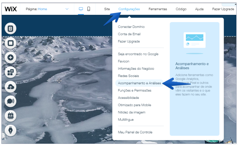 Para isso, você deve acessar seu painel do Wix e clicar em Configurações > Acompanhamento e Análises.