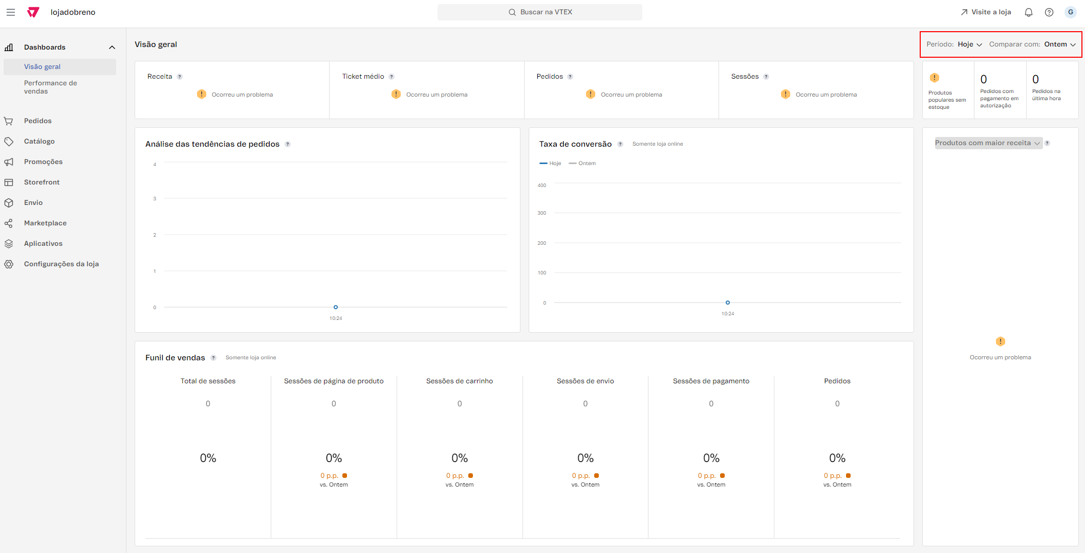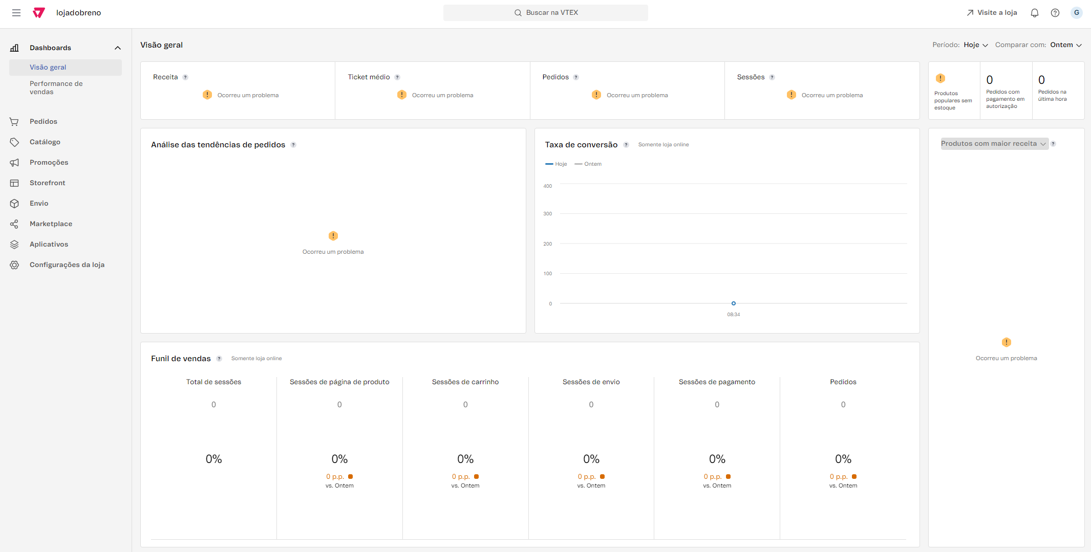 Ao acessar o painel Admin, pode ser que sua loja não carregue métricas na Visão geral do dashboard, e vir acompanhadas de ícones de alerta e a mensagem "Ocorreu um problema". Isso pode ocorrer devido a: