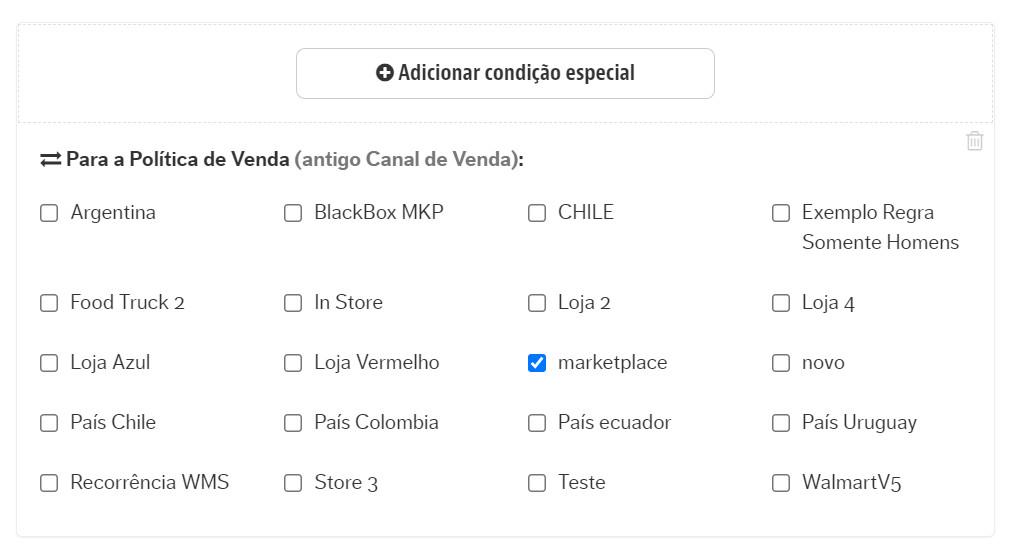 No exemplo acima, o produto estará disponível apenas para canais de venda utilizando as políticas comerciais "Carrefour" e "Marketplace".